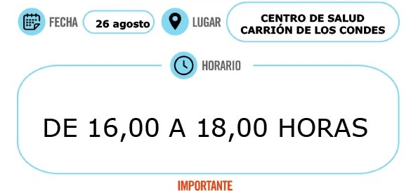 Personas Nacidas en el Año: 1992, 1993, 1994, 1995 y 1996 Empadronados en: ZBS Carrión de los Condes ZBS Frómista ZBS Osorno Fecha: 25 de agosto 2021 «2ª Dosis» Lugar: Centro de Salud de Carrión de los Condes Horarios: de [...]