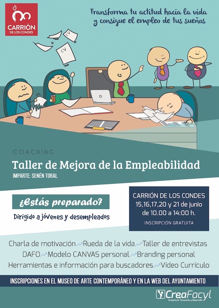 El Ayuntamiento de Carrión de los Condes, con la colaboración de la Diputación de Palencia y la empresa CreaFacyl, organiza un taller gratuito de mejora de la empleabilidad dirigido a jóvenes y desempleados para los próximos 15, 16, 17, 20 y 21 de junio, en horario de 10 a 14 horas.