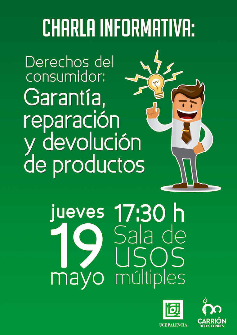 El Ayuntamiento de Carrión de los Condes y la Unión de Consumidores de Palencia-UCE organizan una charla informativa el próximo jueves 19 de mayo sobre los derechos del consumidor en la que formarán a los asistentes sobre cómo actuar en los casos en que es necesario devolver un producto que se ha adquirido o repararlo o ejecutar la garantía.