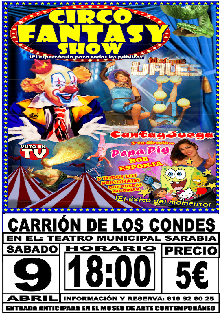 El próximo sábado, a las 18:00 h, llegará al Teatro Sarabia de Carrión de los Condes el espectáculo de circo Fantasy Show, que contará con malabaristas, equilibristas, payasos, artistas del programa Tú sí que vales y personajes de Cantayjuega, Pepa Pig, Bob Esponja, etc. El espectáculo está dirigido a todos los públicos y tiene como objetivo proporcionar una alternativa de entretenimiento, en especial, a los más pequeños de la casa, así como ayudar a la difusión de este tipo de espectáculos de carácter artístico. Las entradas tendrán un coste de 5 € y se pueden adquirir de forma anticipada en el Museo de Arte Contemporáneo.