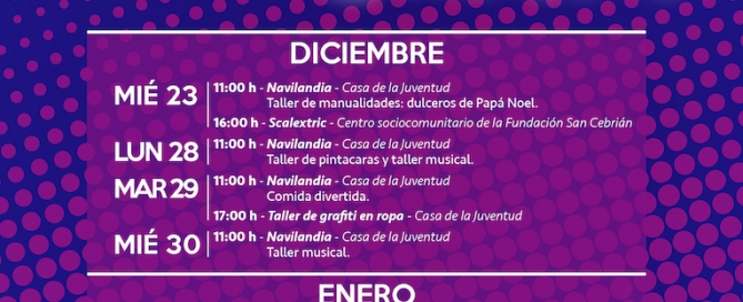 Miércoles 23 de diciembre 11:00 h - Navilandia para niños. Taller de manualidades: dulceros de Papá Noel. Casa de la Juventud. 16:00 - 19:30 h - Scalextric para jóvenes. Centro Sociocomunitario de la Fundación San Cebrián. Sábado 26 de diciembre 18:00 [...]