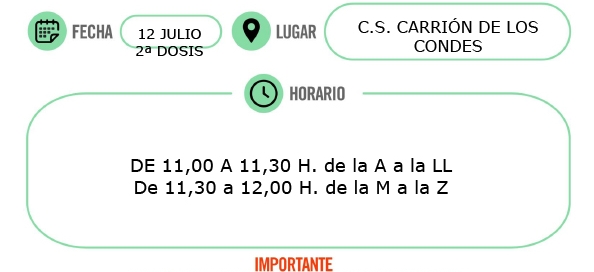 💉 FECHAS PRÓXIMAS VACUNACIONES Personas Nacidas en el Año: 1958 Empadronados en: ZBS Carrión de los Condes Fecha: 12 de julio 2021 «2ª Dosis» Lugar: Centro de Salud de Carrión de los Condes Horarios: de 11:00 a 11:30 de [...]